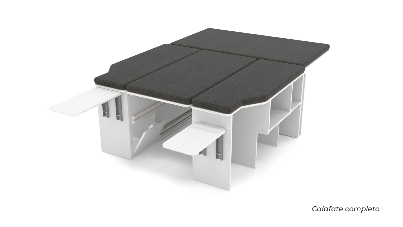 Este kit se compone de cuatro piezas, dos módulos laterales que se anclan a las argollas de carga del vehículo y otras dos piezas móviles que se utilizan para completar una cama de 135×190 cm.