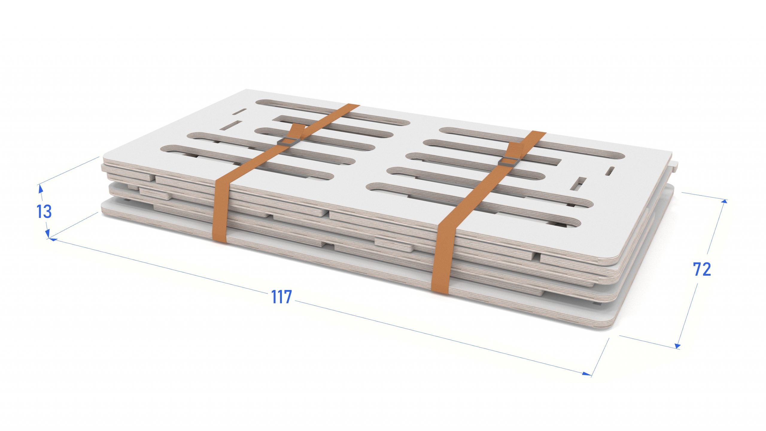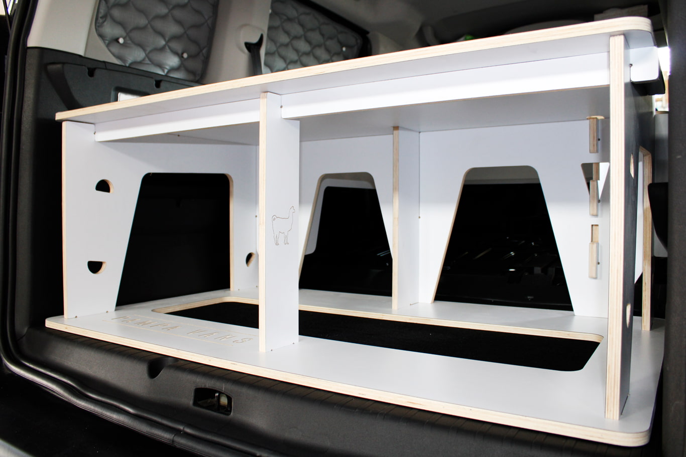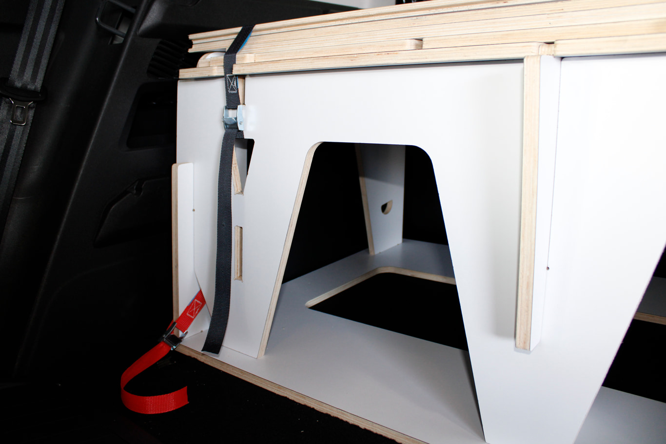 Se trata de un kit ligero y compacto que se coloca en el maletero y permite utilizar todas las plazas de viaje. Abatiendo los asientos traseros se puede desplegar una cama de 115×190 cm.